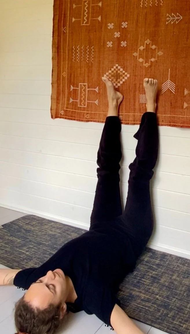 We begin with legs up the wall for 3-5 minutes, observing breath, body and mind, any emotions that may be present and then start to deepen the breath, lengthening the exhale.